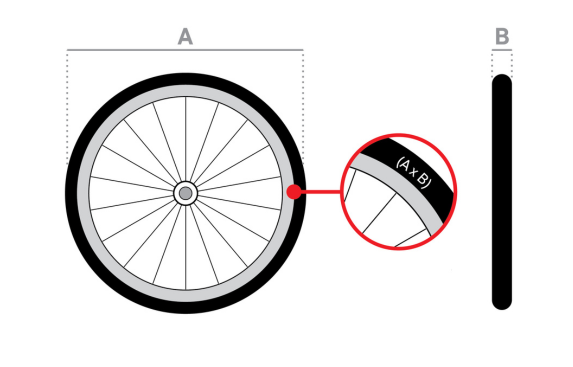 Wheel size is the diameter of your wheel from edge to edge (A). Tyre width is the width of the tire on the wheel (B).