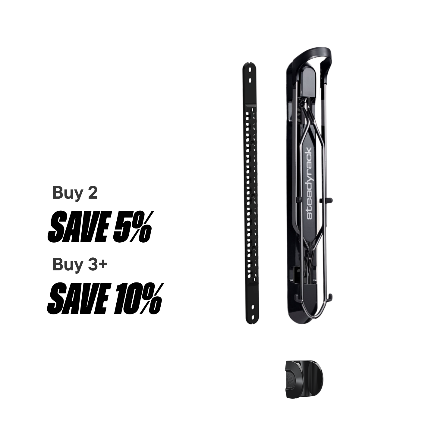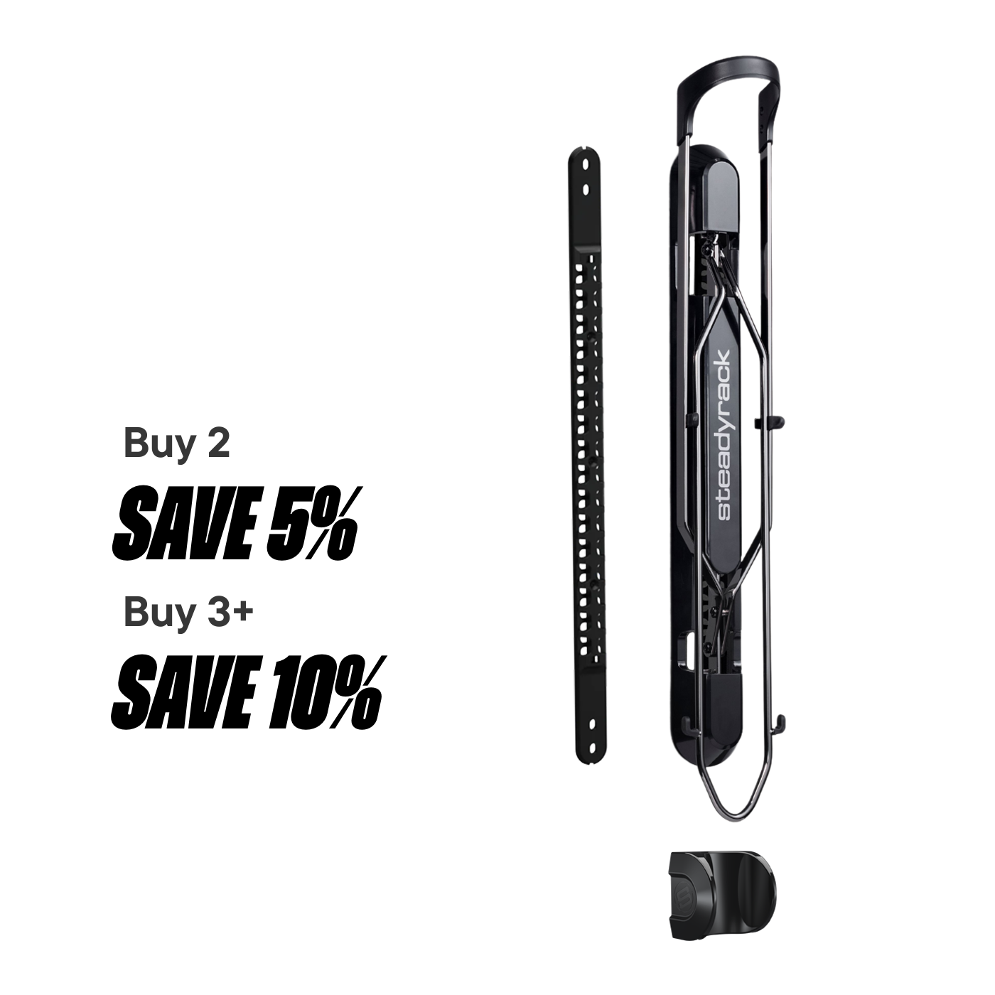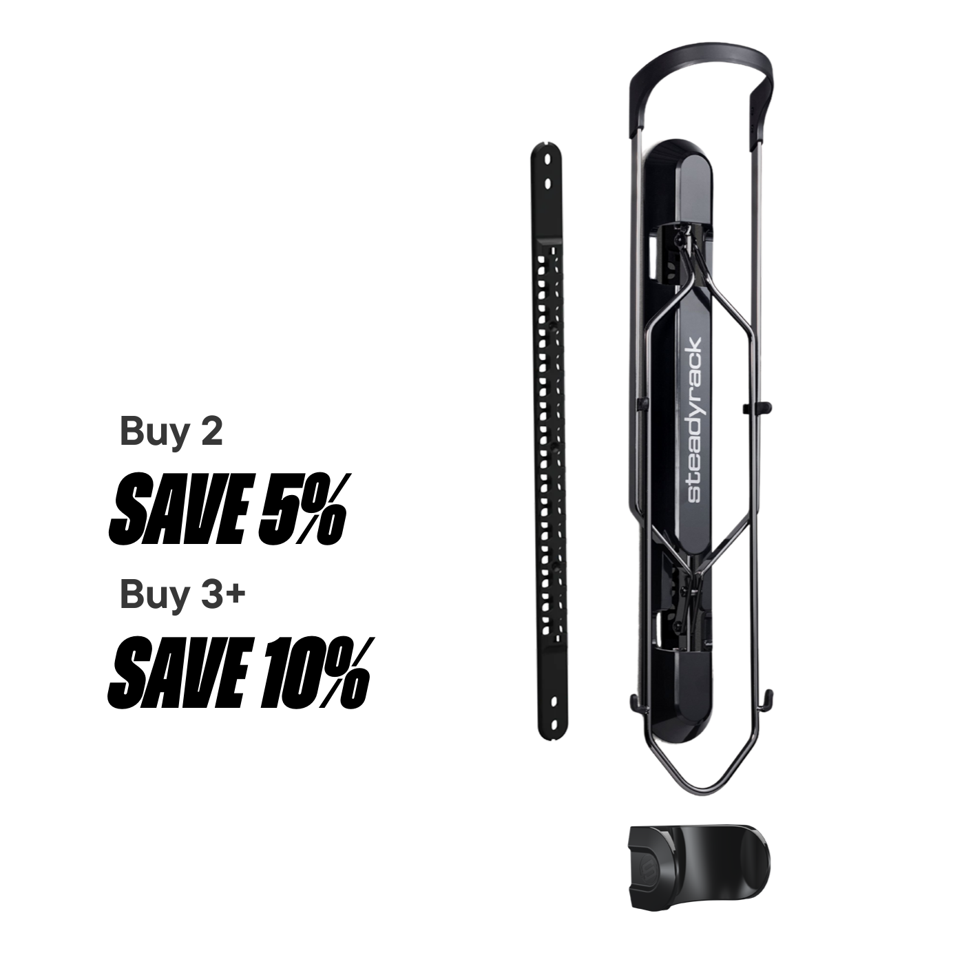 Steadyrack patented clip lock system which allows the rack to fold up out of the way when not in use.